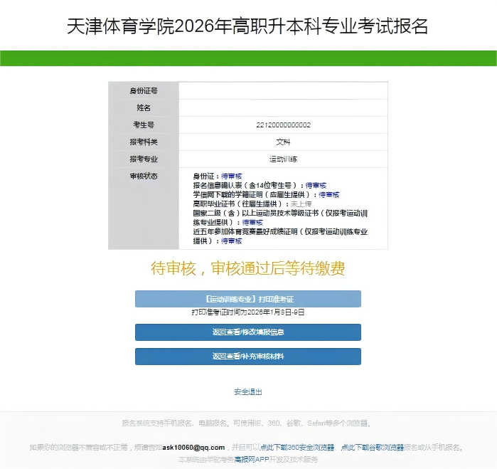 考生可登录http://tjtyzsb.gaokaobaoming.com/或扫描下方二维码进入报名系统,完成基本信息及报名材料的提交。待我校审核通过后在线完成缴费工作,于2026年1月8日-9日打印准考证,按要求参加我校专业课各科目考试。