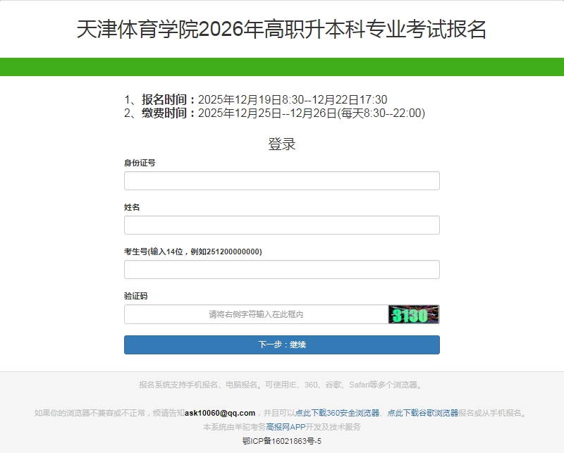 (1)已完成天津市统一报名且报考我校的考生,根据页面提示输入身份证号、姓名、考生号(14位)以及验证码,完成后点击【下一步:继续】。