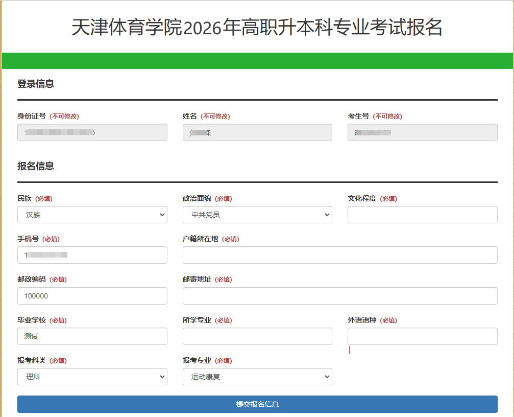 (2)进入信息填报页面,根据页面提示准确输入各项信息,填写完成后点击【提交报名信息】(考生只限填报一个专业)。